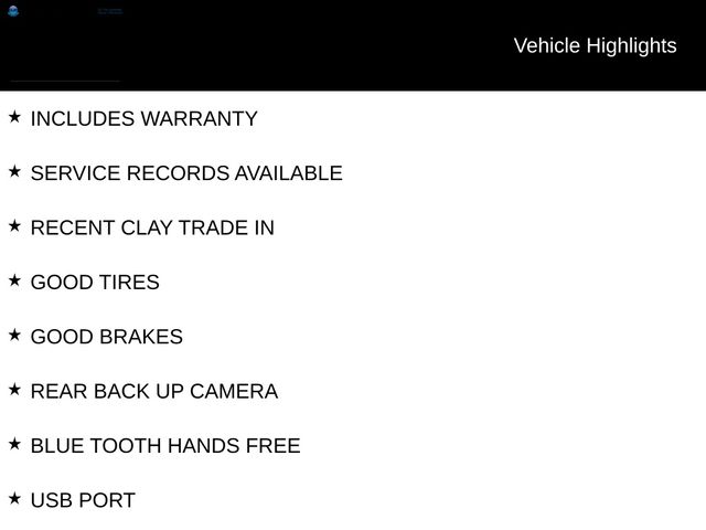 INCLUDES WARRANTY, SERVICE RECORDS AVAILABLE, RECENT CLAY TRADE IN, GOOD TIRES, GOOD BRAKES, REAR BACK UP CAMERA, BLUE TOOTH HANDS FREE, USB PORT, APPLE CAR PLAY.