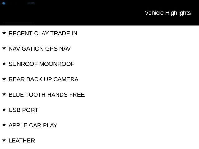 RECENT CLAY TRADE IN, NAVIGATION GPS NAV, SUNROOF MOONROOF, REAR BACK UP CAMERA, BLUE TOOTH HANDS FREE, USB PORT, APPLE CAR PLAY, LEATHER, HEATED SEATS, BLIND SPOT DETECTOR.