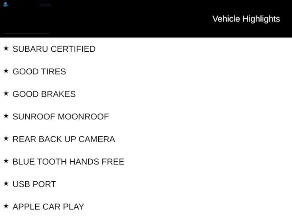 SUBARU CERTIFIED, GOOD TIRES, GOOD BRAKES, SUNROOF MOONROOF, REAR BACK UP CAMERA, BLUE TOOTH HANDS FREE, USB PORT, APPLE CAR PLAY, HEATED SEATS, BLIND SPOT DETECTOR.