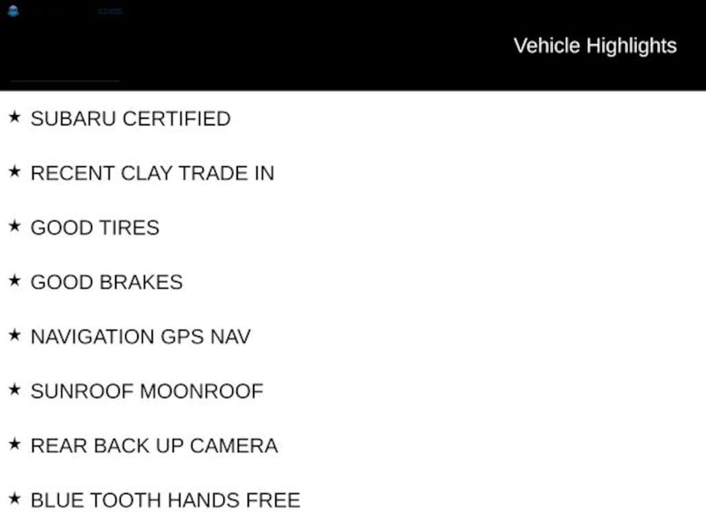 SUBARU CERTIFIED, RECENT CLAY TRADE IN, GOOD TIRES, GOOD BRAKES, NAVIGATION GPS NAV, SUNROOF MOONROOF, REAR BACK UP CAMERA, BLUE TOOTH HANDS FREE, USB PORT, APPLE CAR PLAY, HEATED SEATS, BLIND SPOT DETECTOR.