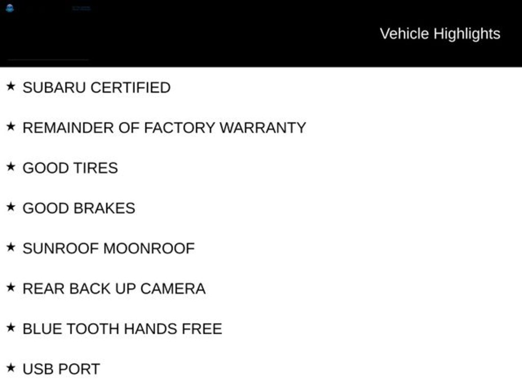 SUBARU CERTIFIED, REMAINDER OF FACTORY WARRANTY, GOOD TIRES, GOOD BRAKES, SUNROOF MOONROOF, REAR BACK UP CAMERA, BLUE TOOTH HANDS FREE, USB PORT, APPLE CAR PLAY, HEATED SEATS, BLIND SPOT DETECTOR.