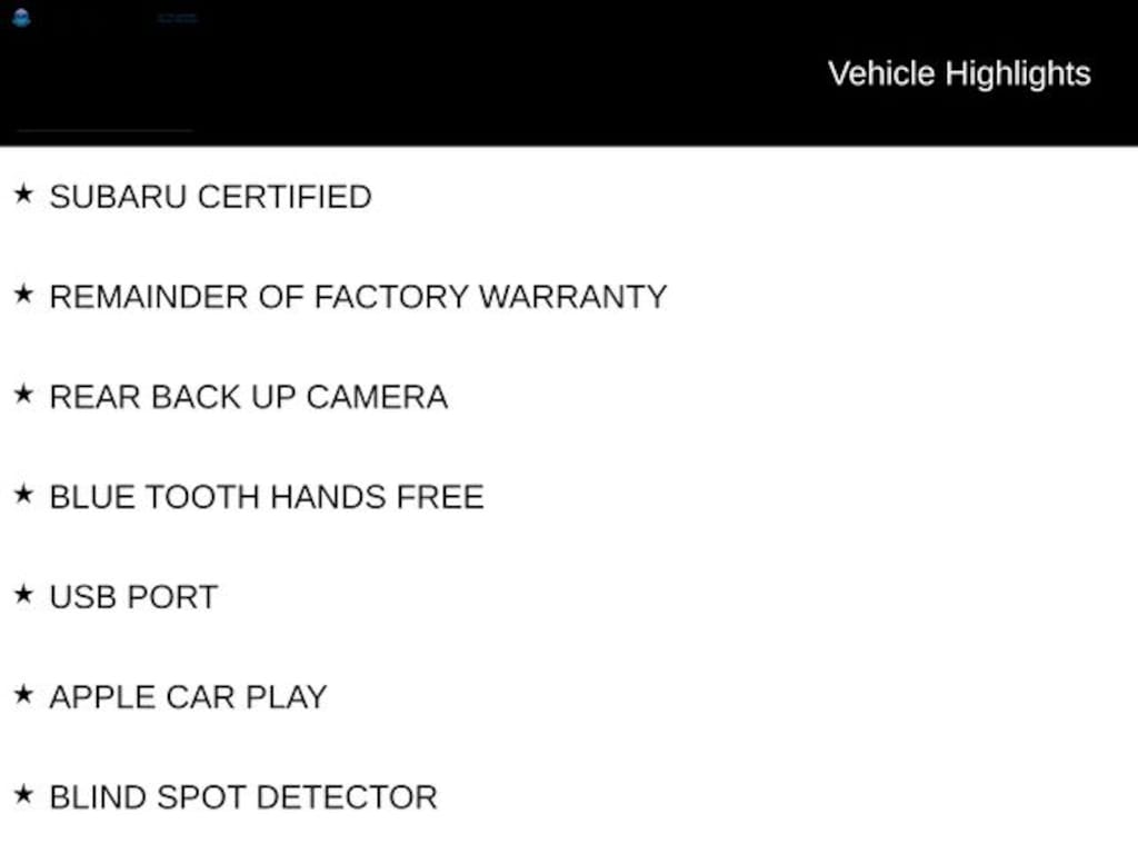 SUBARU CERTIFIED, REMAINDER OF FACTORY WARRANTY, REAR BACK UP CAMERA, BLUE TOOTH HANDS FREE, USB PORT, APPLE CAR PLAY, BLIND SPOT DETECTOR.